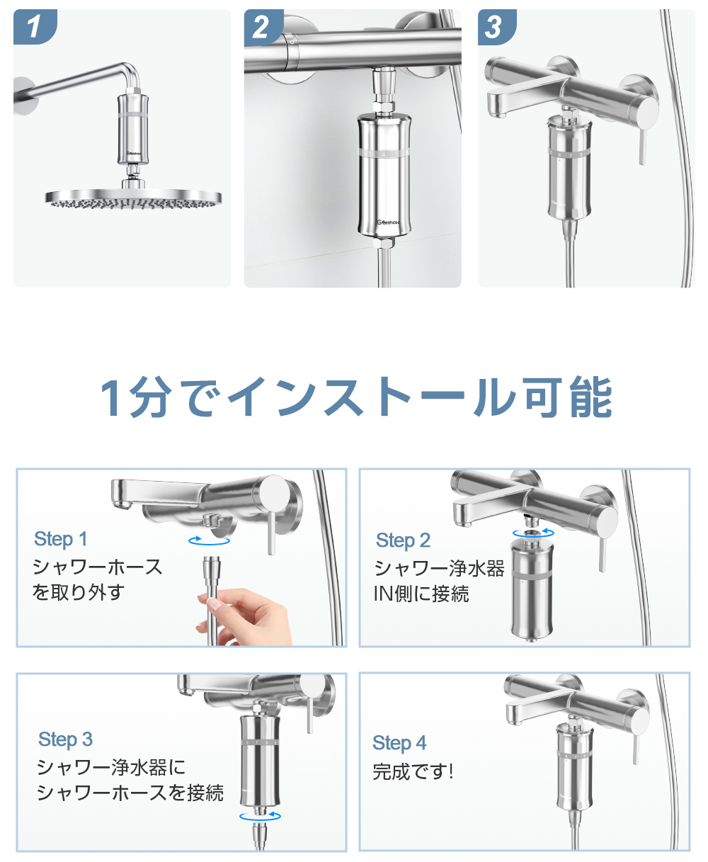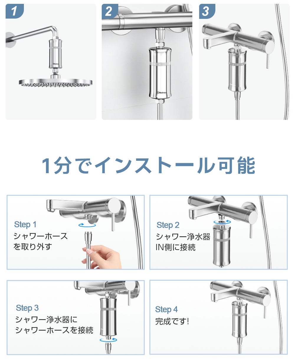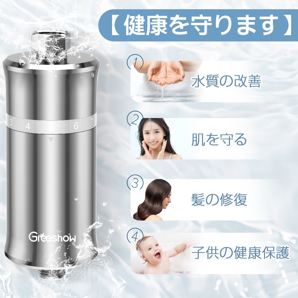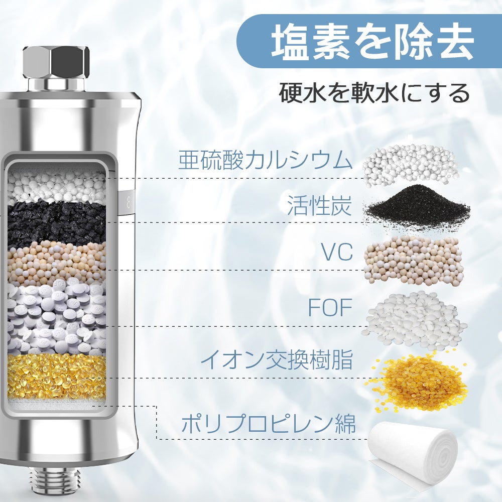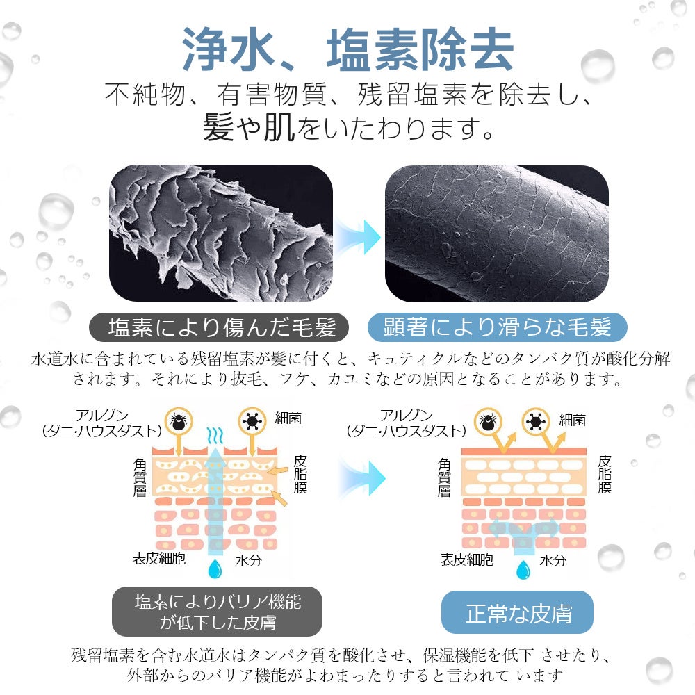強力なフィルターシステムにより、塩素、重金属、その他の有害物質を除去し、肌と髪を保護し、快適でリラックスしたシャワー体験を提供します。