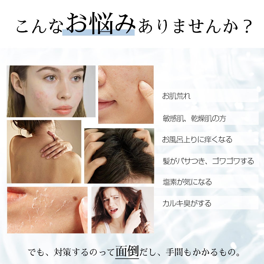 残留塩素を含む水道水はタンパク質を酸化させ、保湿機能を低下させたり、外部からのバリア機能がよわまったりすると言われています。
