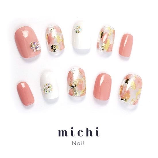肌なじみのいいピンクとゴールドのホイルアートが華やかで可愛らしいデザインです。ホワイトカラーが入ることで派手過ぎず上品さを残した大人の雰囲気です。