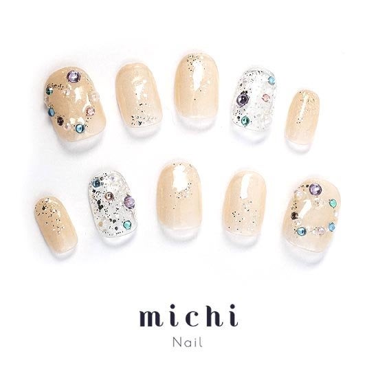 オーロララメを重ねたシアーベージュとカラフルなビジューが輝くクリアネイルのデザイン。上品さの中に輝きがあり魅力的な指先を演出してくれます。
