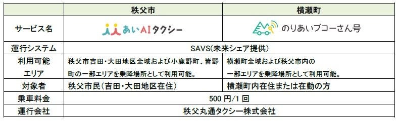 秩父市では既存の乗合タクシーサービスに、株式会社未来シェア(以下「未来シェア」)が提供するAIデマンド運行システム「SAVS(注1)」を導入し、新たなAIデマンドタクシー「あいAIタクシー」の運用を開始します。横瀬町では既存のAIデマンドタクシー「のりあいブコーさん号」に、秩父市内の乗降場所を追加します(2023年2月以降順次追加予定)。両サービスが互いに連携し合う形で運用を行うことで、交通・物流課題解決に向けた生活インフラの強化を目指します。