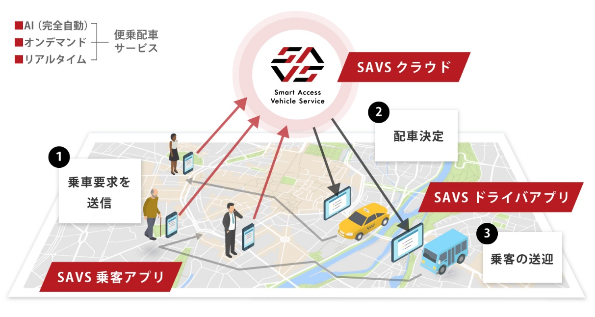 SAVSとは、タクシー(デマンド交通)と路線バス(乗合交通)の長所を掛け合わせた、AIによるリアルタイムな便乗配車計算を行うサービスです。クラウド上のAIプラットフォームがスマートデバイスと通信し、刻々と変化する車両と人・物の移動状況において、全ての空間移動と希望時間を同時に満たす車両の走行ルートを瞬時に決定します。この技術により、都市レベルでの最適交通を実現します。