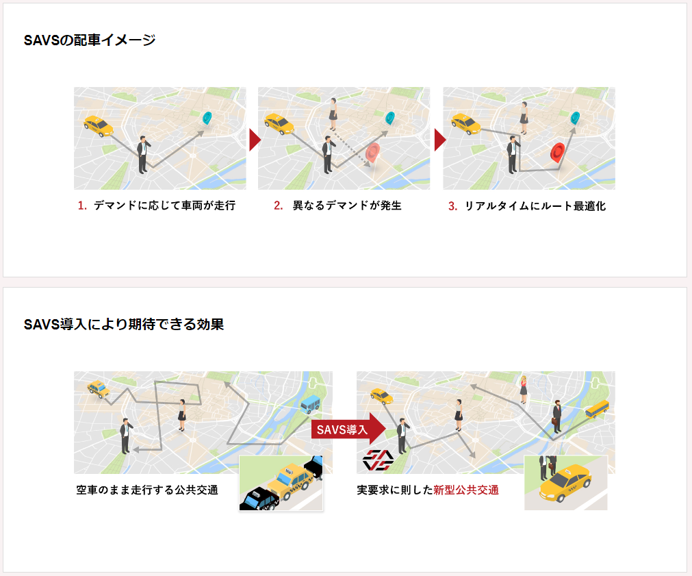 時間やルートを固定せず、AIによるリアルタイムな便乗配車計画を行うプラットフォーム型サービス。刻々と変化する車両と人・物の移動状況において、全ての空間移動と希望時間を同時に満たす車両の走行ルートを瞬時に決定する。(http://www.miraishare.co.jp/savs/)
