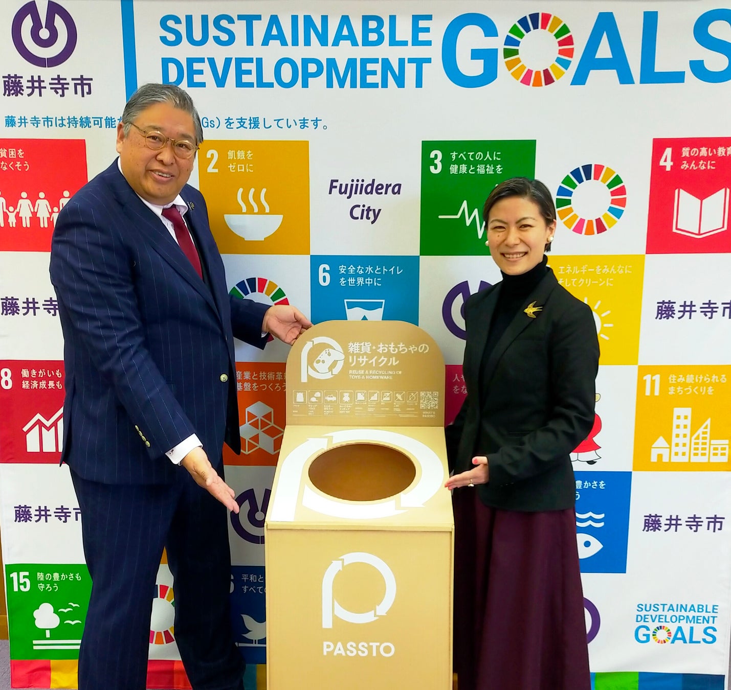 本協定により、令和7年4月1日〜令和8年3月31日の期間、ECOMMITが運営する資源循環サービス「PASSTO(パスト)」の不要品回収ボックスを、藤井寺市の市役所をはじめとした公共施設の4拠点に順次設置し、ご家庭で不要になった雑貨やおもちゃを廃棄するのではなく、リユースへと繋げる仕組みを提供することで、地域全体で資源循環に取り組みます。