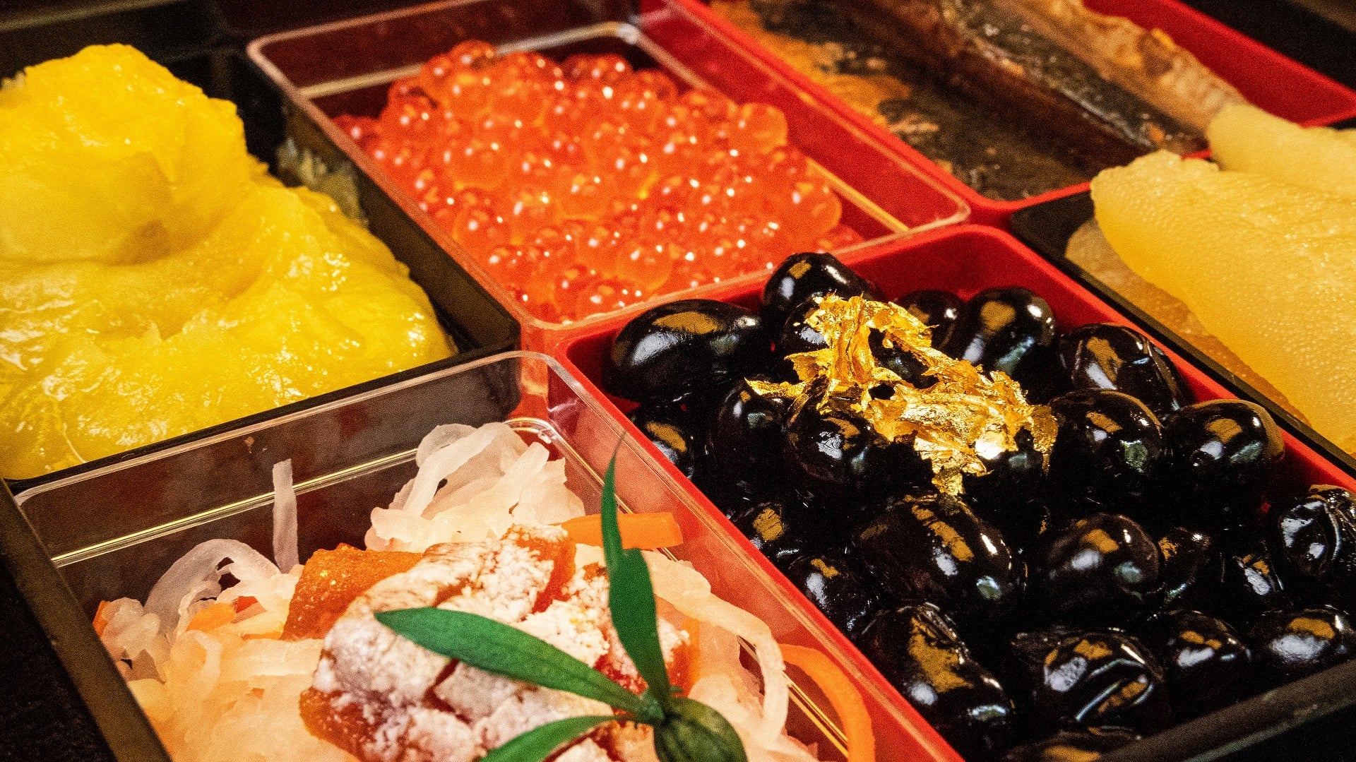 黒豆、干し柿なます、いくら、鰊旨煮、栗金団、数の子