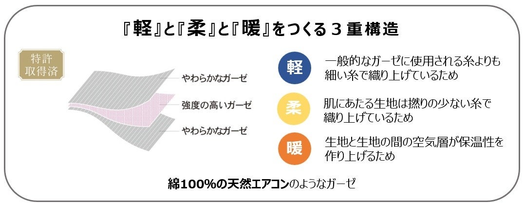 UCHINOがタオルの製造技術を最大限にいかして開発した、国内外10か国で特許を取得しているコットン100%の特殊なガーゼ素材です。吸湿・吸水性、通気性、保温性をバランスよく兼ね備えたマシュマロガーゼ製品は、国内の百貨店だけでなく、シンガポール高島屋やアメリカのセレクトショップなど海外でも展開されており、国内外で高い評価を得ています。