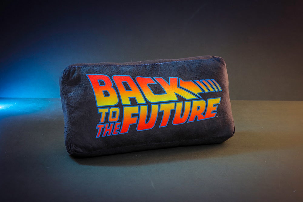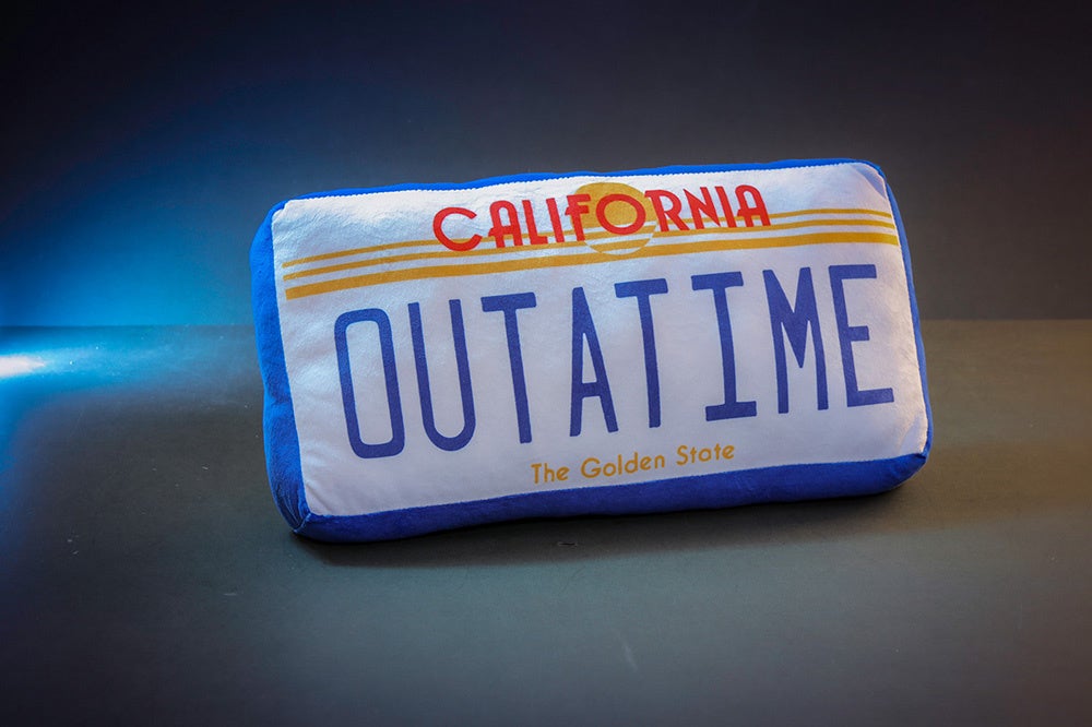 『バック・トゥ・ザ・フューチャー』に登場するデロリアンのナンバープレートと、映画のロゴをクッション化!