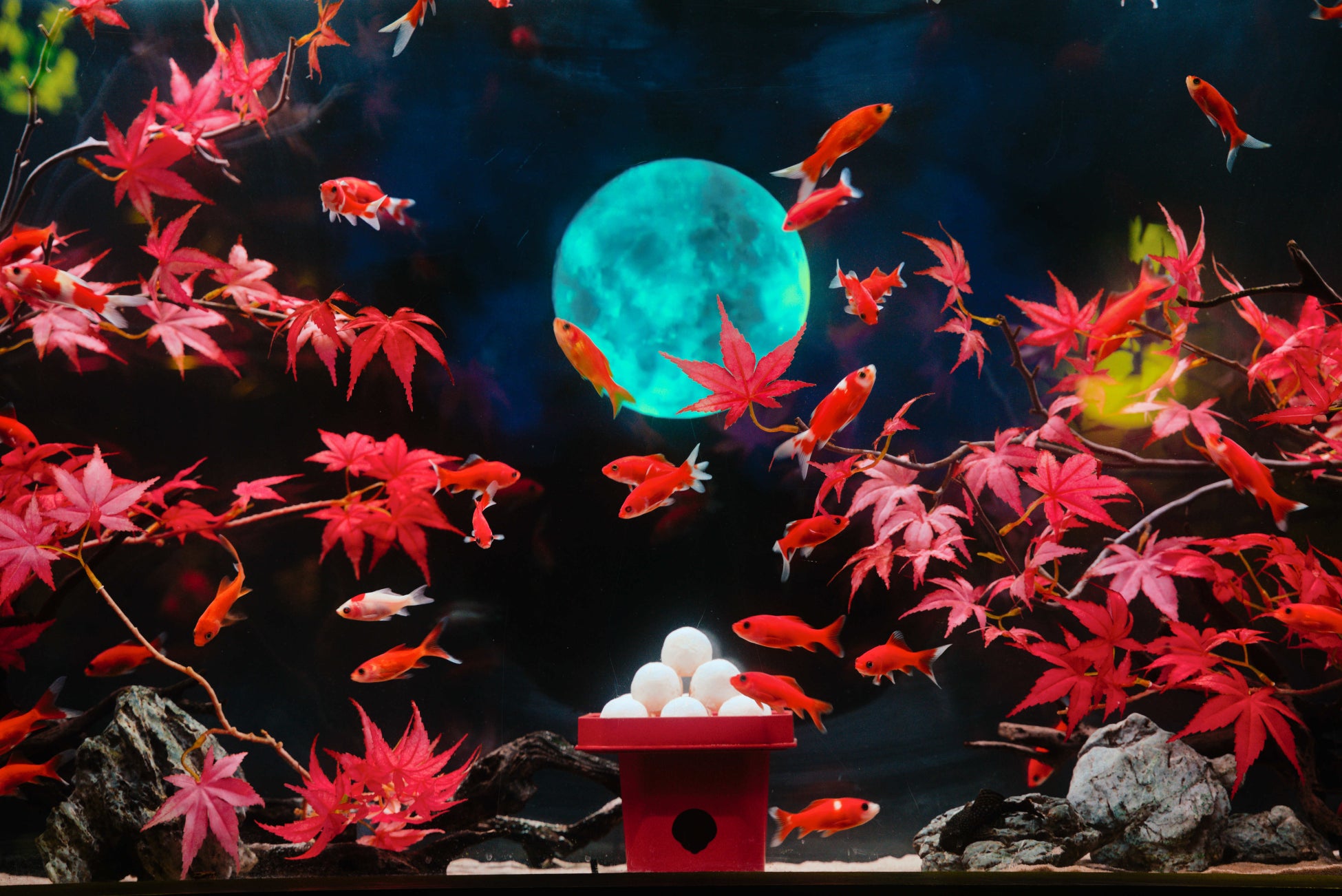 天井から吊るされた紅葉が秋の深まりを感じさせる企画展示エリアです。中央の水槽には月見団子のオブジェが配置され、季節感あふれる展示が特徴です。