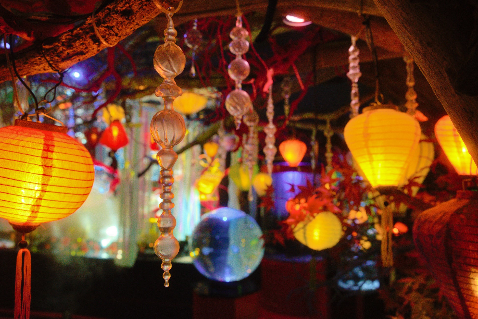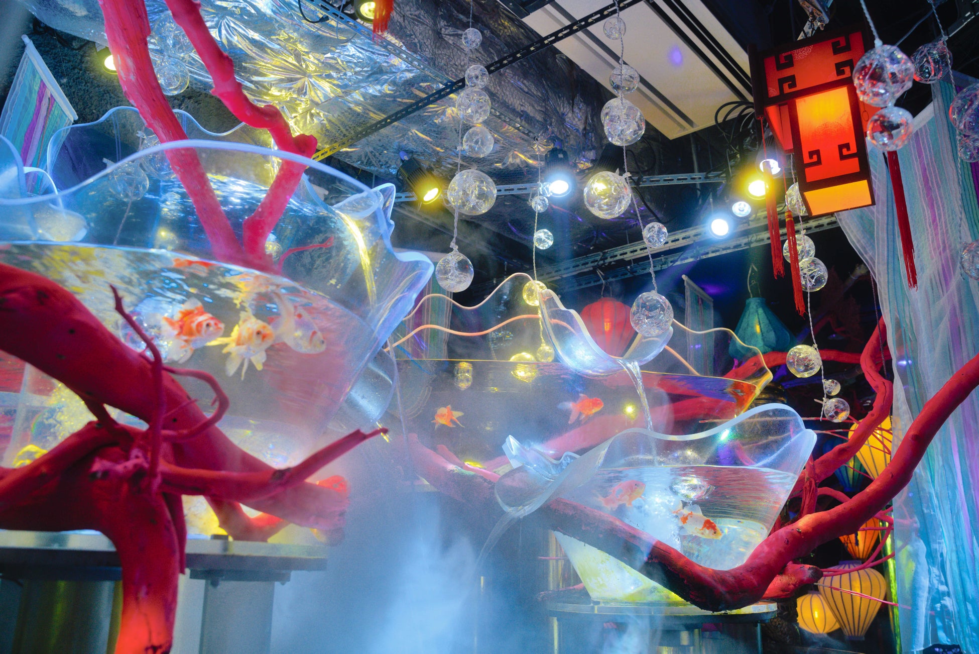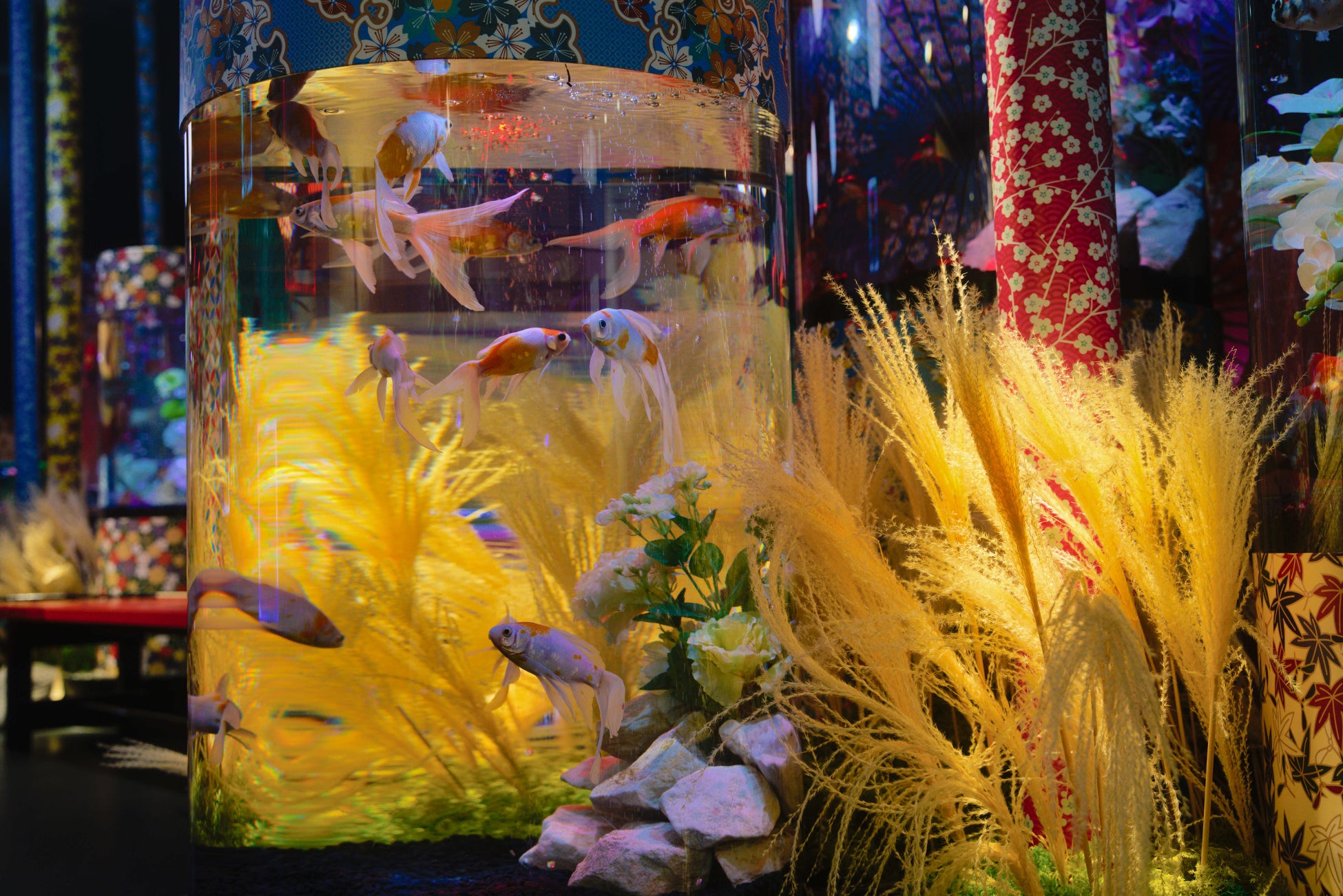 アーティスト「生田目礼一」とコラボレーション。ガラスオブジェクトを雨粒に見立て、龍宮に降り注ぐ雨の景色を表現しました。また、水槽内にもガラス玉のアートワークがレイアウトされ、光を反射した幻想的な空間を生み出しています。