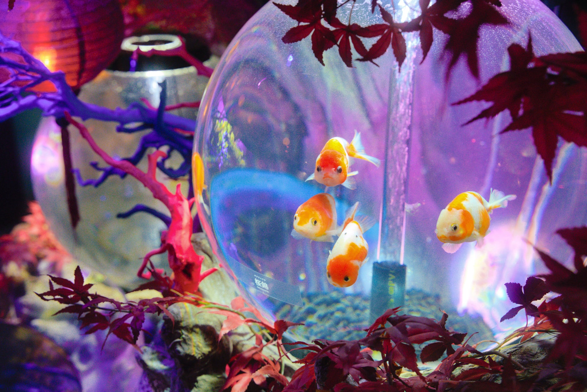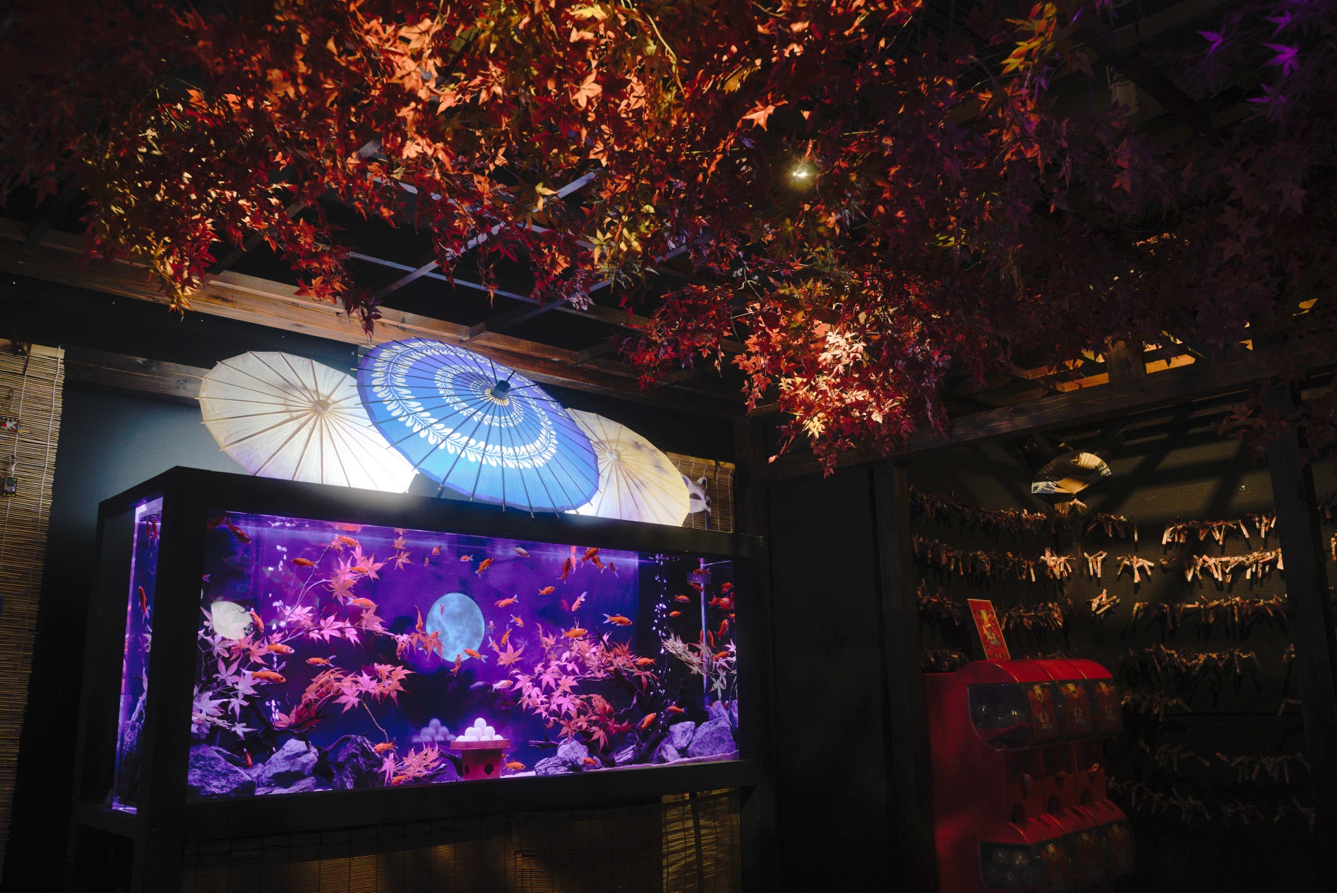 水中に降り注ぐガラスの雨と紅葉で彩る「龍宮時雨」がお台場アクアリウムにて開催。ガラス造形アーティスト生田目礼一とのコラボで、日本の伝統的な秋の風景を表現。