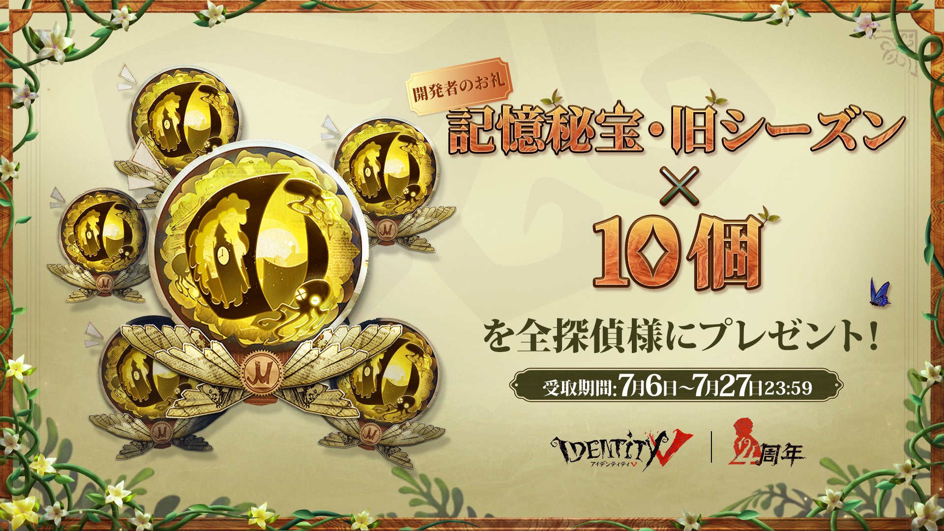 また、『Identity Ⅴ』を応援してくださる全プレイヤーに感謝の意を示すべく、4周年記念イベントの開催期間中、全サーバーのプレイヤーに「記憶秘宝・旧シーズン」10個を無料でプレゼントします。皆さまにより良いゲーム体験をお届けできれば幸いです。