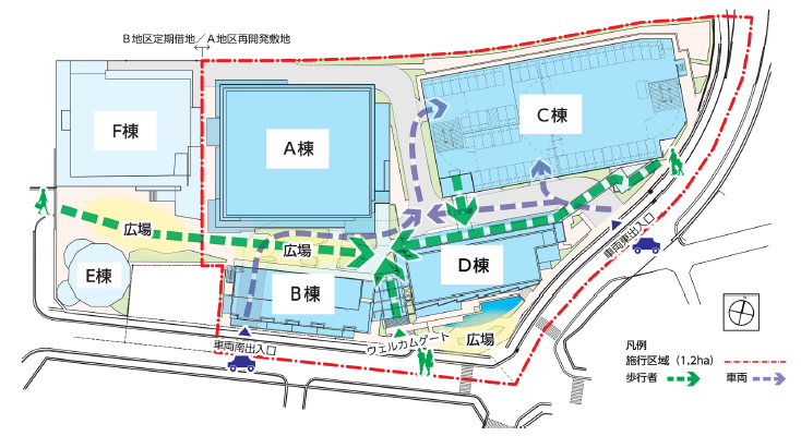 三島駅南口東街区においては、第一種市街地再開発事業を推進するA地区(本開発事業)と、今後着手予定の事業用定期借地事業に取り組むB地区を一体的に開発する計画です。施設建築物としては、A地区に4棟(A~D棟)、B地区に2棟(E~F棟)、合計6棟の建物建設を行い、A地区には、駐車場、医療施設、子育て支援施設、店舗、事務所、住宅、B地区には、店舗、ホテルなどの機能の導入を予定しています。