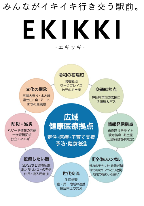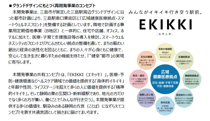 本開発事業の共有コンセプトは、「EKIKKI(エキッキ)」。医療・予防・健康増進などヘルスケア領域での価値を提供する「身体的イキイキ」と年齢や性別、ライフステージを超えて多くの人に価値を提供する「精神的イキイキ」。そして静岡の東の玄関口・新幹線駅であり、地元の方だけでなく多くの方が集い、働くことで「みんなが行き交う」。本開発事業が提供する多くの価値を、馴染みのある静岡の方言(ことば)になぞらえてコンセプトを表す共通言語として皆さまに