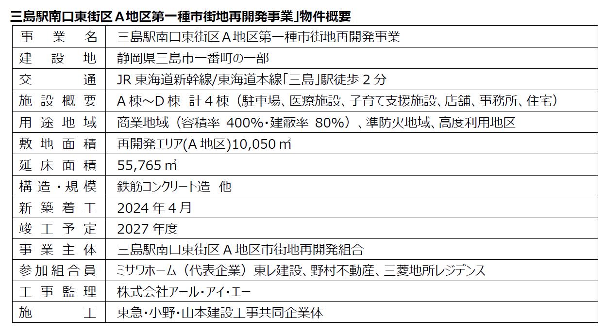 三島駅南口東街区A地区市街地再開発組合(理事長 井上裕幸、以下「組合」)ならびに、同組合の参加組合員であるミサワホーム株式会社(東京都新宿区、代表取締役社長執行役員 作尾徹也、以下「ミサワホーム」)、東レ建設株式会社(大阪府大阪市北区、代表取締役社長 角川政信、以下「東レ建設」)、野村不動産株式会社(東京都新宿区、代表取締役社長 松尾大作、以下「野村不動産」)、三菱地所レジデンス株式会社(東京都千代田区、代表取締役 社長執行役員 宮島正治、以下「三菱地所レジデンス」)の5者が推進する「三島駅南口東街区A地区第一種市街地再開発事業(以下、「本開発事業」)」 がこのたび、2024年4月15日に着工しました。