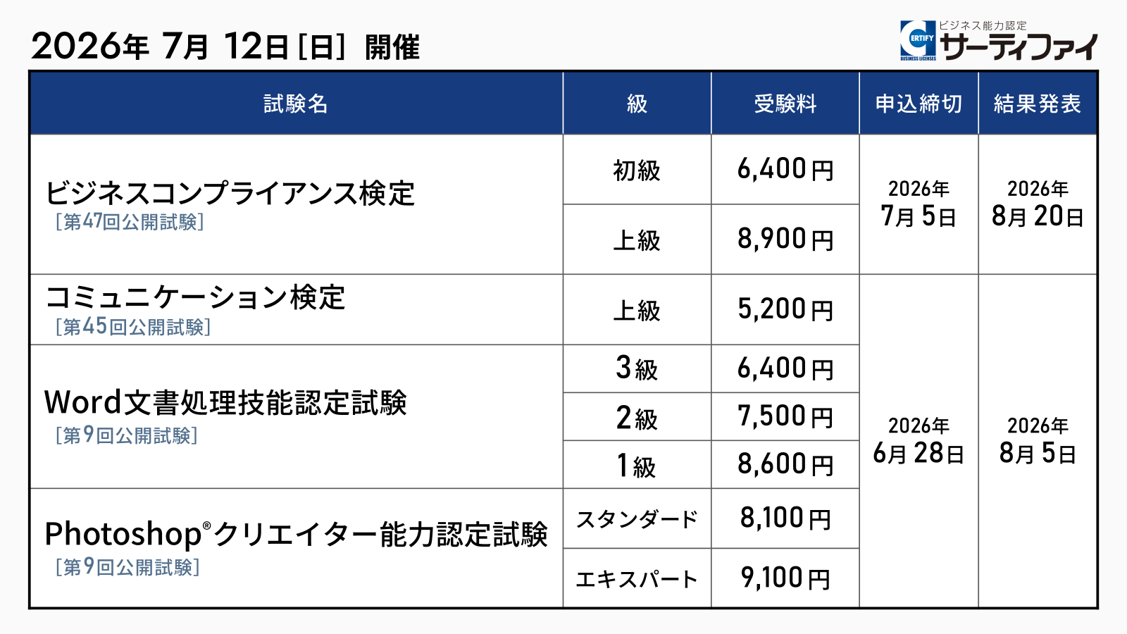 株式会社サーティファイ(本社:東京都中央区、代表取締役:瀧澤茂、以下「サーティファイ」)は、2026年7月12日(日)に開催する「ビジネスコンプライアンス検定」「コミュニケーション検定」「Word文書処理技能認定試験」「Photoshopクリエイター能力認定試験」の公開試験の申込受付を2026年4月28日より開始しました。