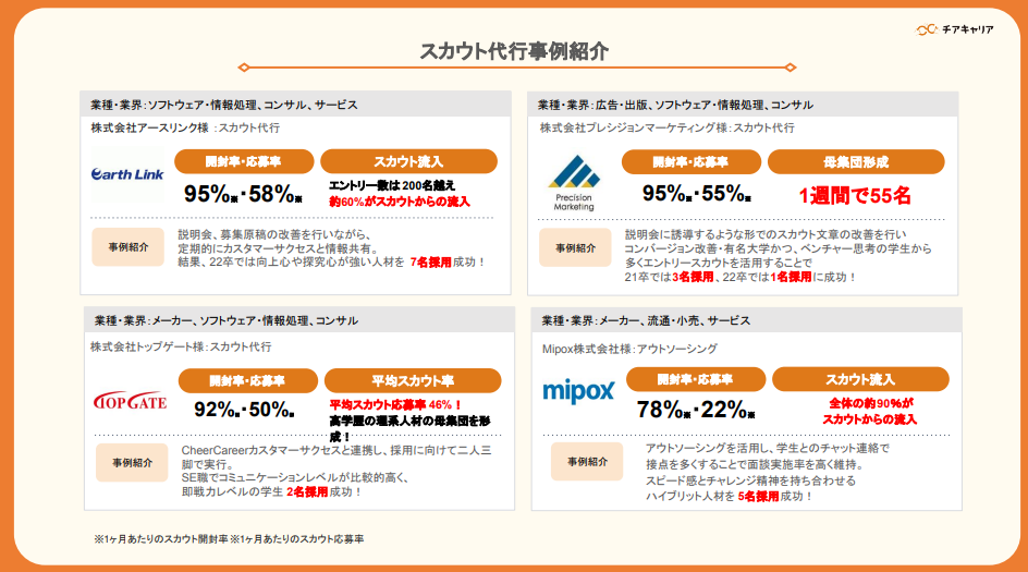 また、リソース不足の企業様へはアウトソーシングサービスも取り揃えているため安心して自社にあった採用ターゲットの採用につなげていただけます。過去のスカウト代行実績では1週間で55名の母集団形成に成功した企業もいます。それ以外にも採用動画の制作や原稿制作、採用広報研修など幅広いサポート内容で採用課題にあわせたソリューションの提供を行います。