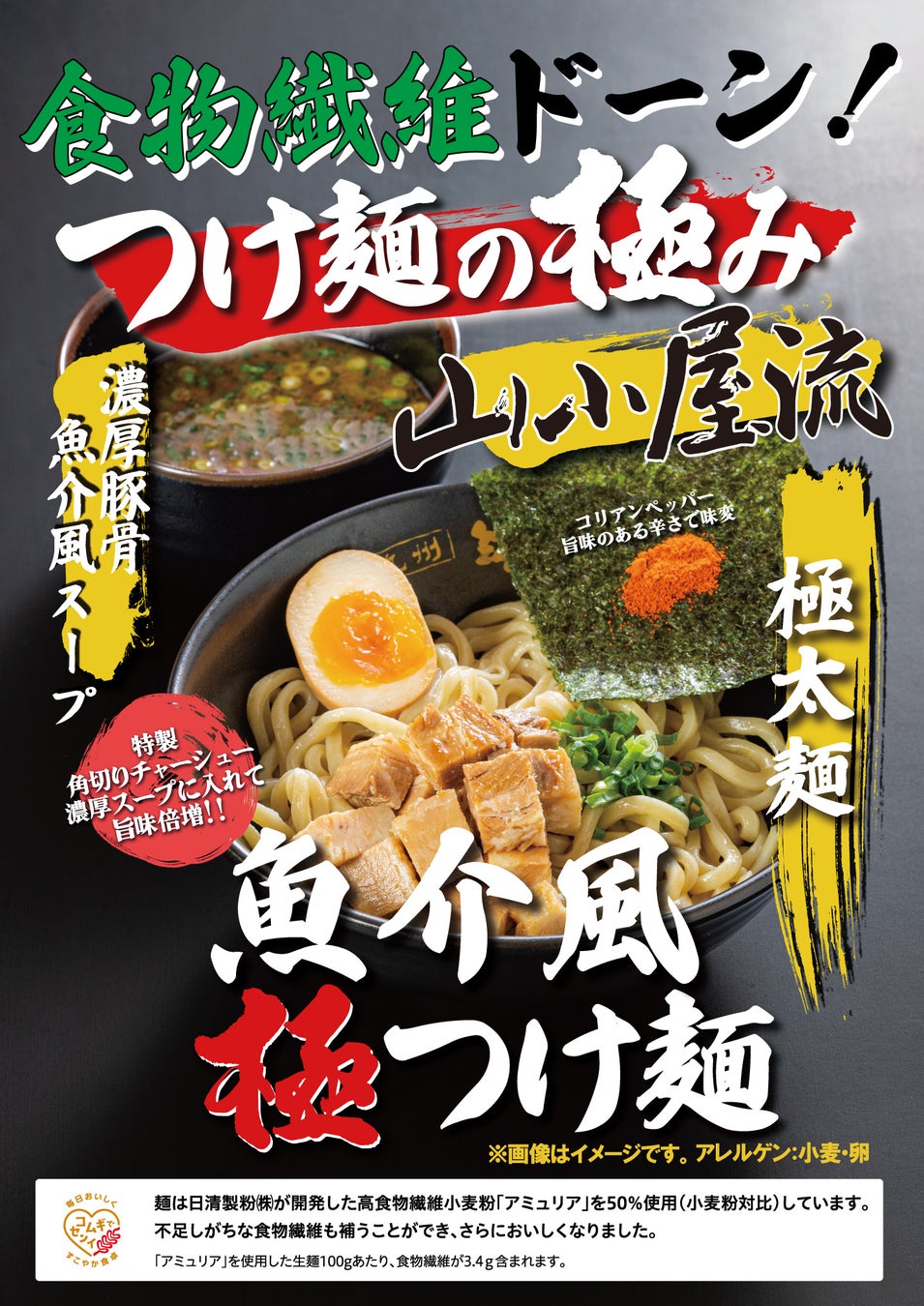 これに伴い、既存メニューの極太ワシワシ麺『やまじろう』および魚介風『極(きわみ)つけ麺』を「アミュリア」入り極太麺に変更し、お客様の健康を意識したメニューとしてリニューアルします。