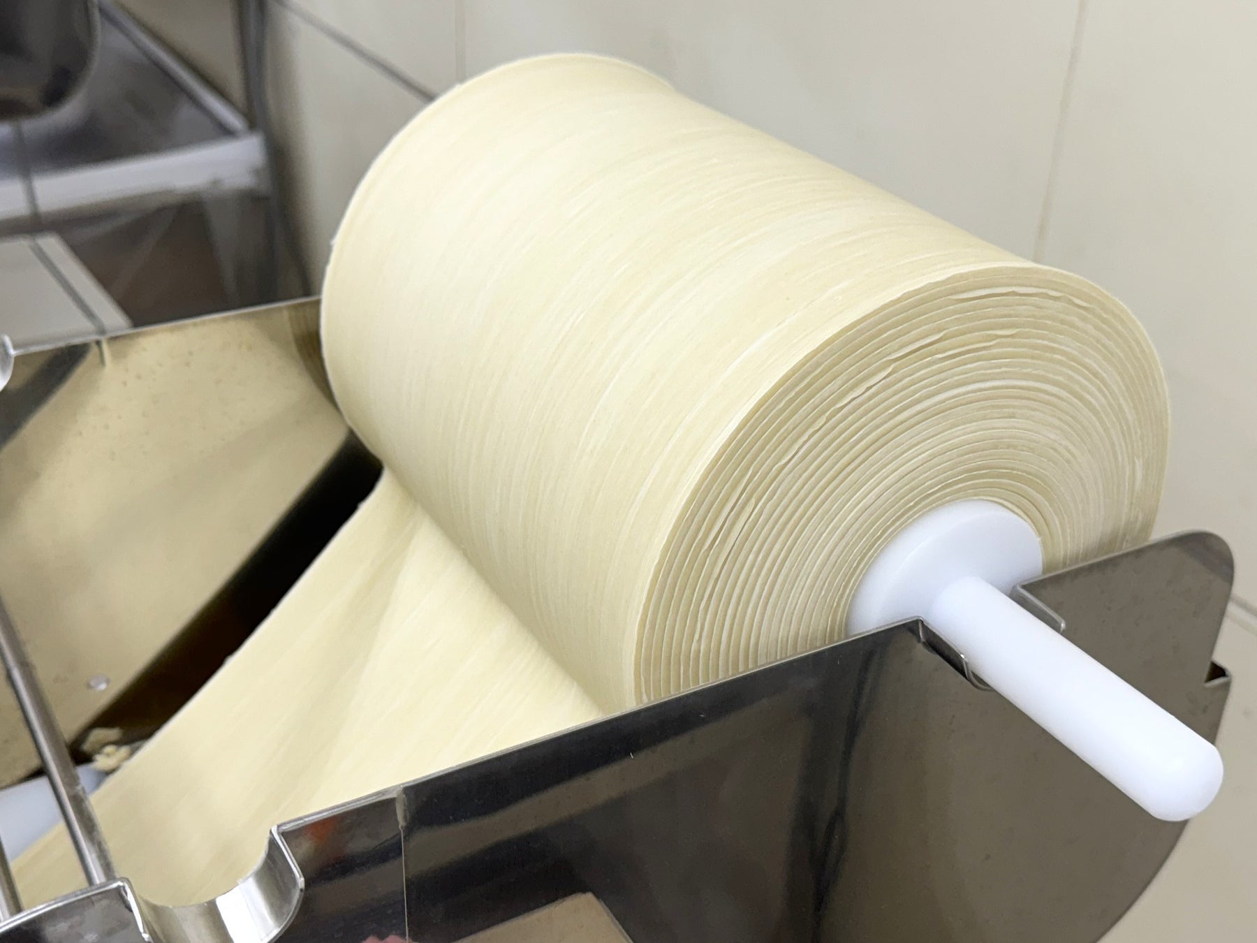 それで、出来る限り「アミュリア」の含有量を多するため、でんぷんや他の小麦粉などを独自にブレンドする事で、ほど良いコシのある当社の豚骨スープにあった麺を試行錯誤を重ね開発し、『アミュリア』50%(小麦粉対比)を使用し、こうして歯切れの良さの中に程よいコシ(弾力)を感じ、美味しく食べる事ができる高食物繊維小麦粉配合の”極太ワシワシ麺”が誕生しました。