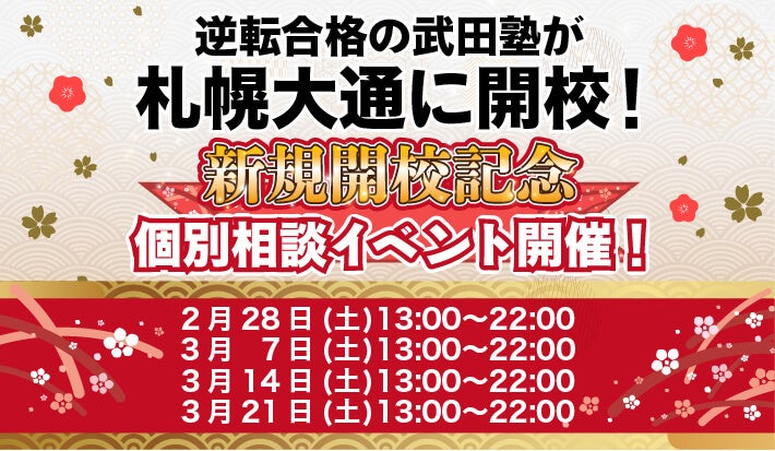 学習塾「武田塾」を全国に展開している株式会社A.ver(本社:東京都文京区 以下「武田塾」)は、2月14日、北海道札幌市に武田塾札幌大通校を開校することをお知らせいたします。武田塾札幌大通校の開校を記念して、札幌大通校では個別相談イベントを実施いたします。開催予定は以下の通りです。2月27日(土) 13:00~22:003月7日(土) 13:00~22:003月14日(土) 13:00~22:003月21日(土) 13:00~22:00