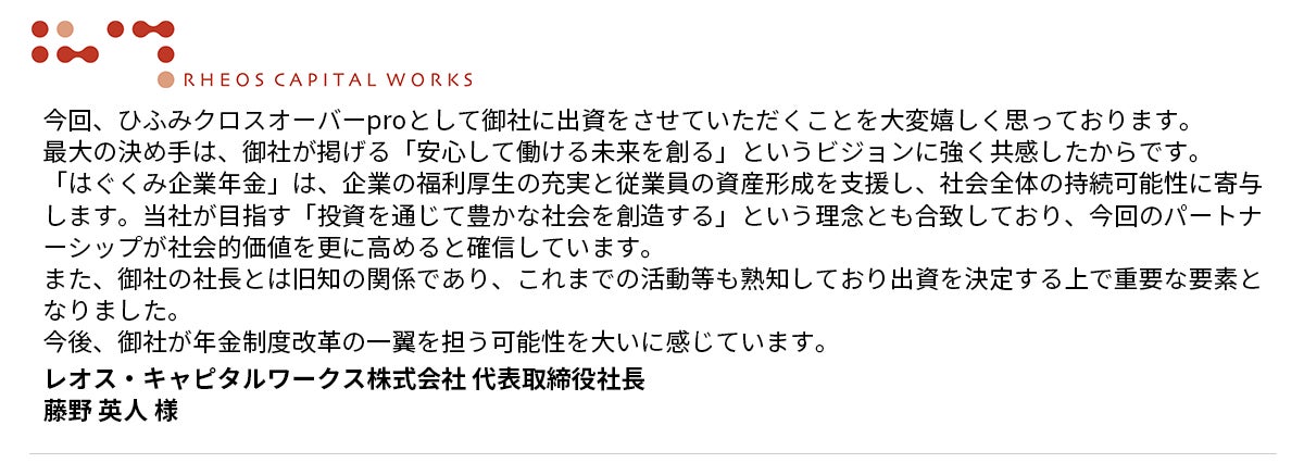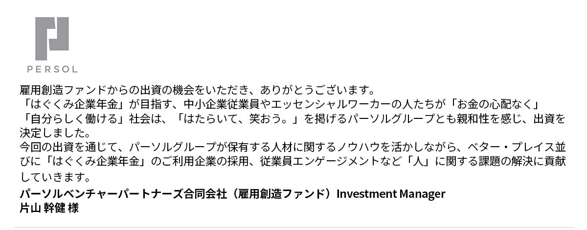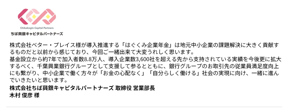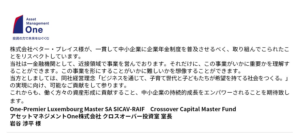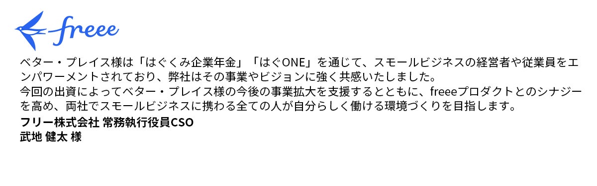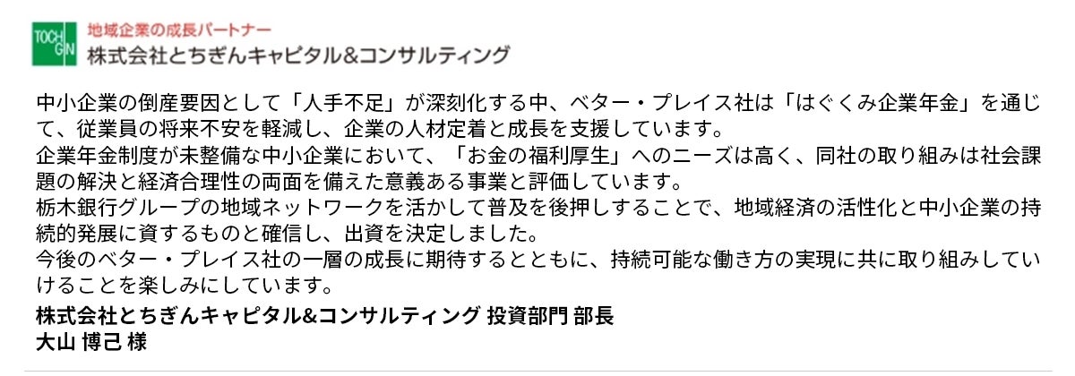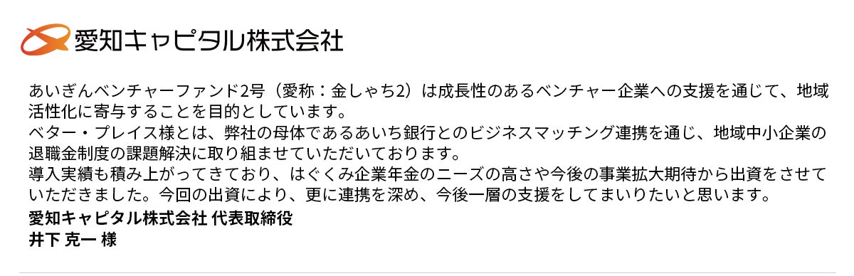 今回の資金調達は、より多くの中小企業の皆さまに企業年金制度をお届けすることで、働く方々の資産形成を支援するとともに、企業の採用力や人材定着率の向上に寄与したいというベター・プレイスの思いに、投資家の皆さまからご賛同いただき、実現いたしました。