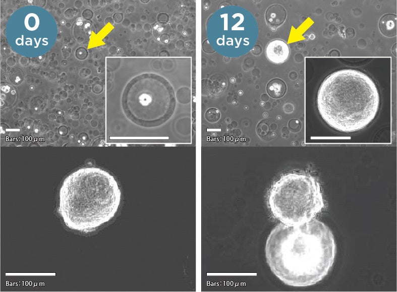 上の図は、実際にヒト乳がん細胞由来のMCF-7をAGMのカプセル内で培養してスフェロイド(※2)化した様子で、12日間で順調に培養ができています。このカプセルには多孔性のアガロースゲルのシェルで数十~数百nm(ナノメートル)の細孔が開いており、封入後もガスや培地成分の交換が容易に行えます。
