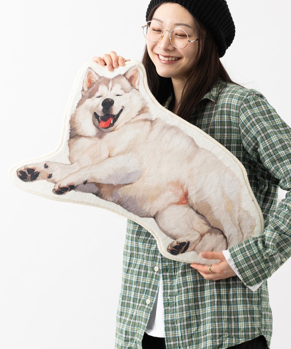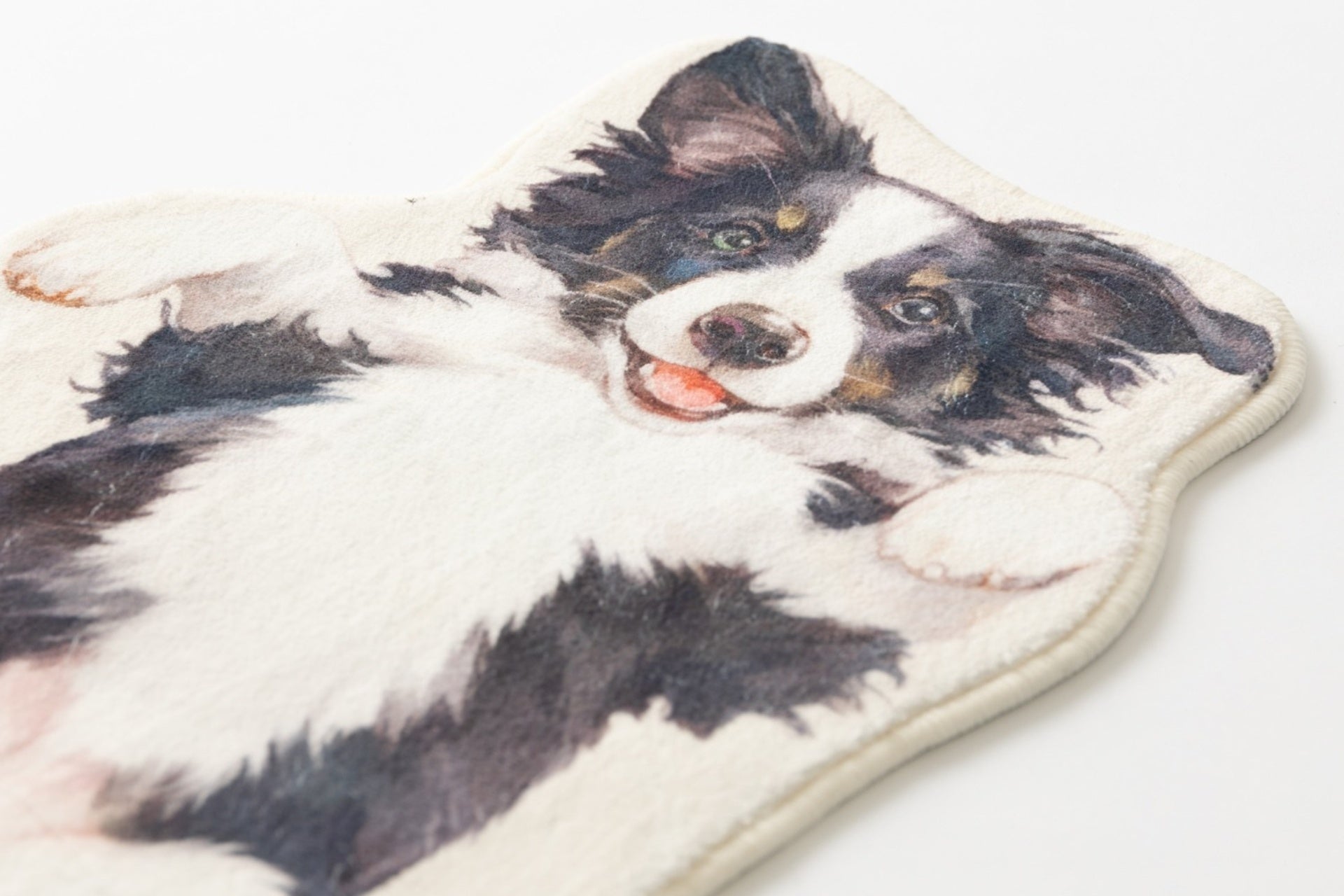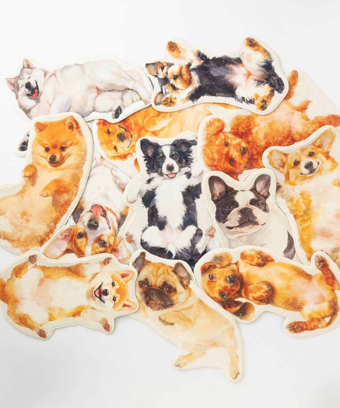 愛くるしいワンちゃんたちが描かれた、ダイカットデザインの起毛マット。