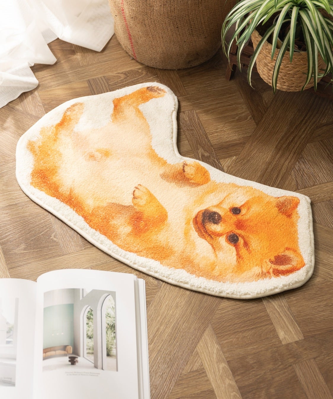ごろんとお腹を見せるワンちゃんデザインのもこもこ起毛ミニマットが新登場。