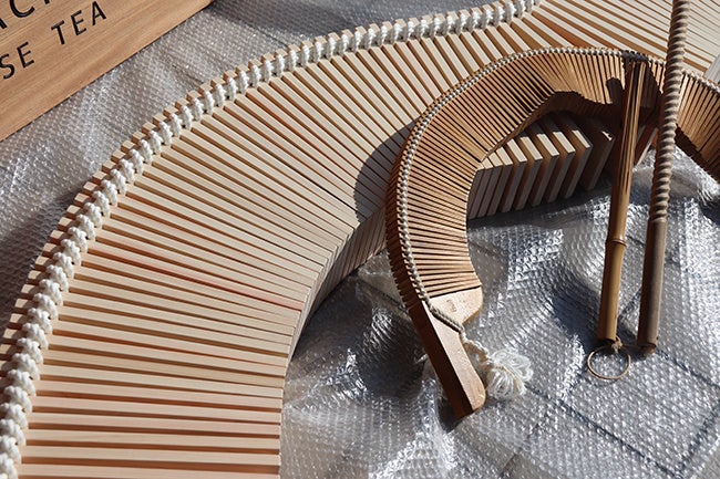 108枚の板を結んだ形状はこの地方に伝わる相互扶助の精神《結》(ゆい)を連想させます。そこでささら屋の思いを象徴するものとして今回「巨大さらら」を製作し、お店に飾ることにいたしました。