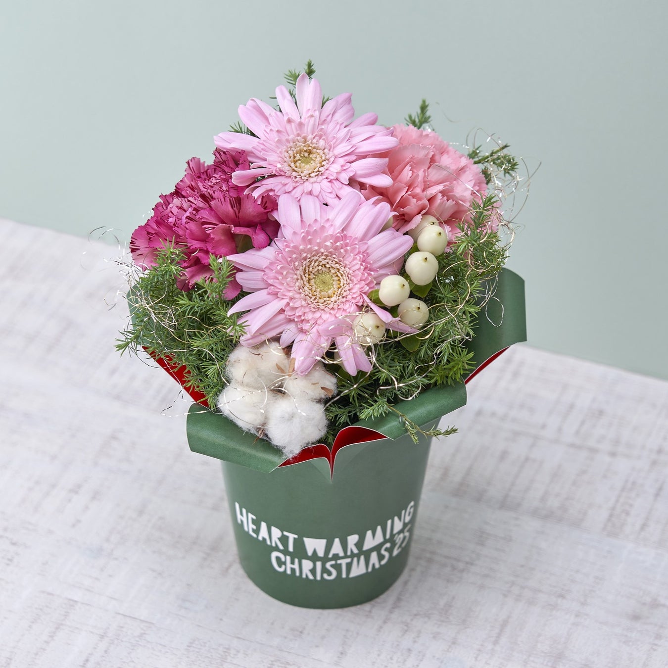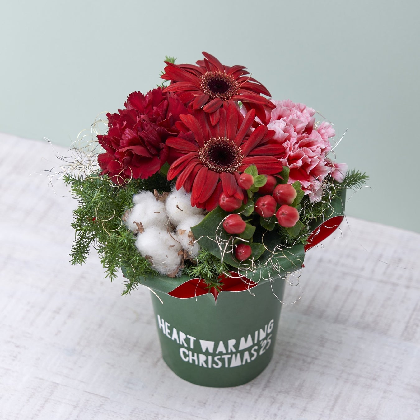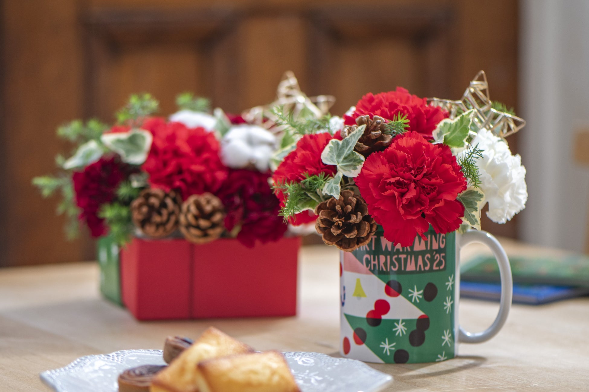 鈴木マサル氏とコラボレーションした、特別なクリスマスボックスアレンジメント。2025年のテーマ「Heart Warming Christmas」のロゴが入ったオリジナルボックスには、赤と緑のクリスマスカラーを基調とした花々が詰まっています。あたたかみのあるコットンや、愛らしい赤いカーネーション、季節感たっぷりの松かさを添えて。大切な人に、心ときめくホリデーシーズンをお届けします。ボックスはお花が終わった後も小物入れとして活用できます。