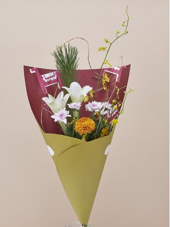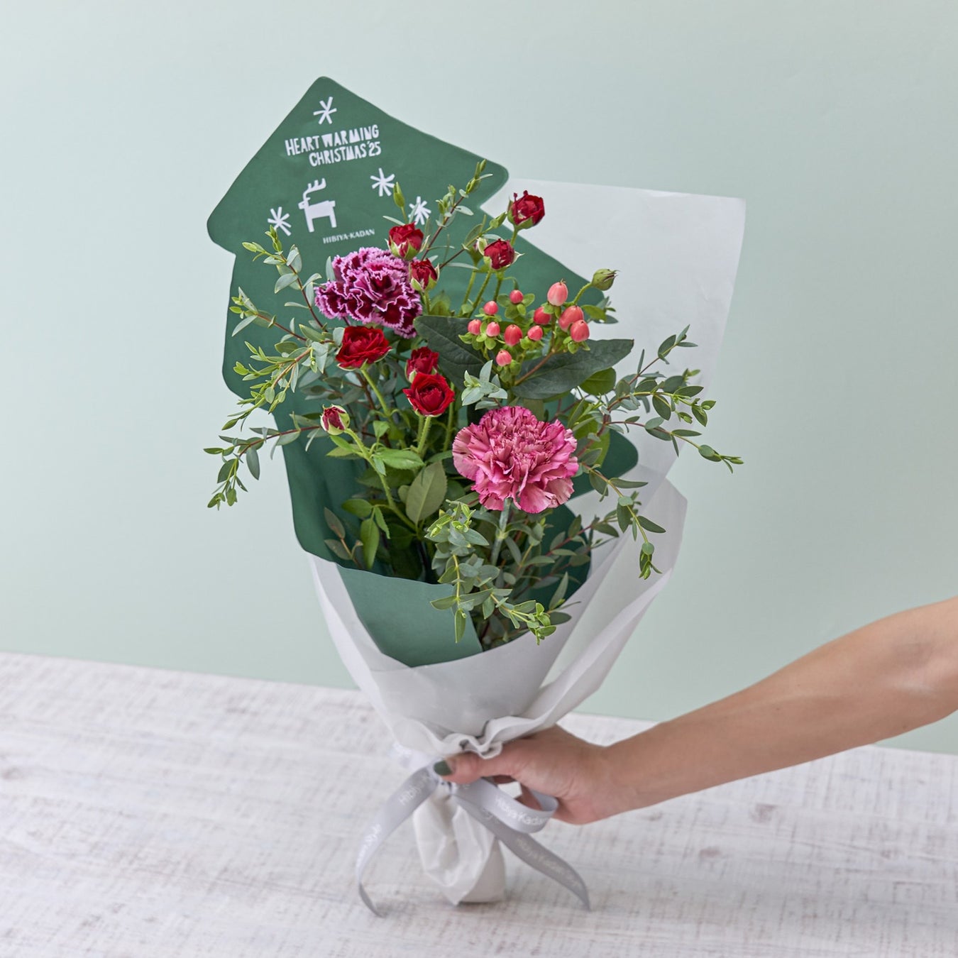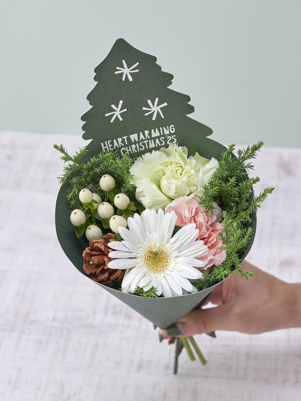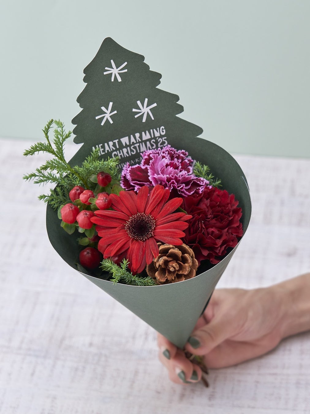 季節のお花とグリーンを小さく束ねた、上品で華やかなブーケ。クリスマスツリーをデザインしたペーパーが、聖夜の気持ちをさりげなく届けます。ちょっとした贈り物や、テーブルを彩るインテリアにもおすすめです。