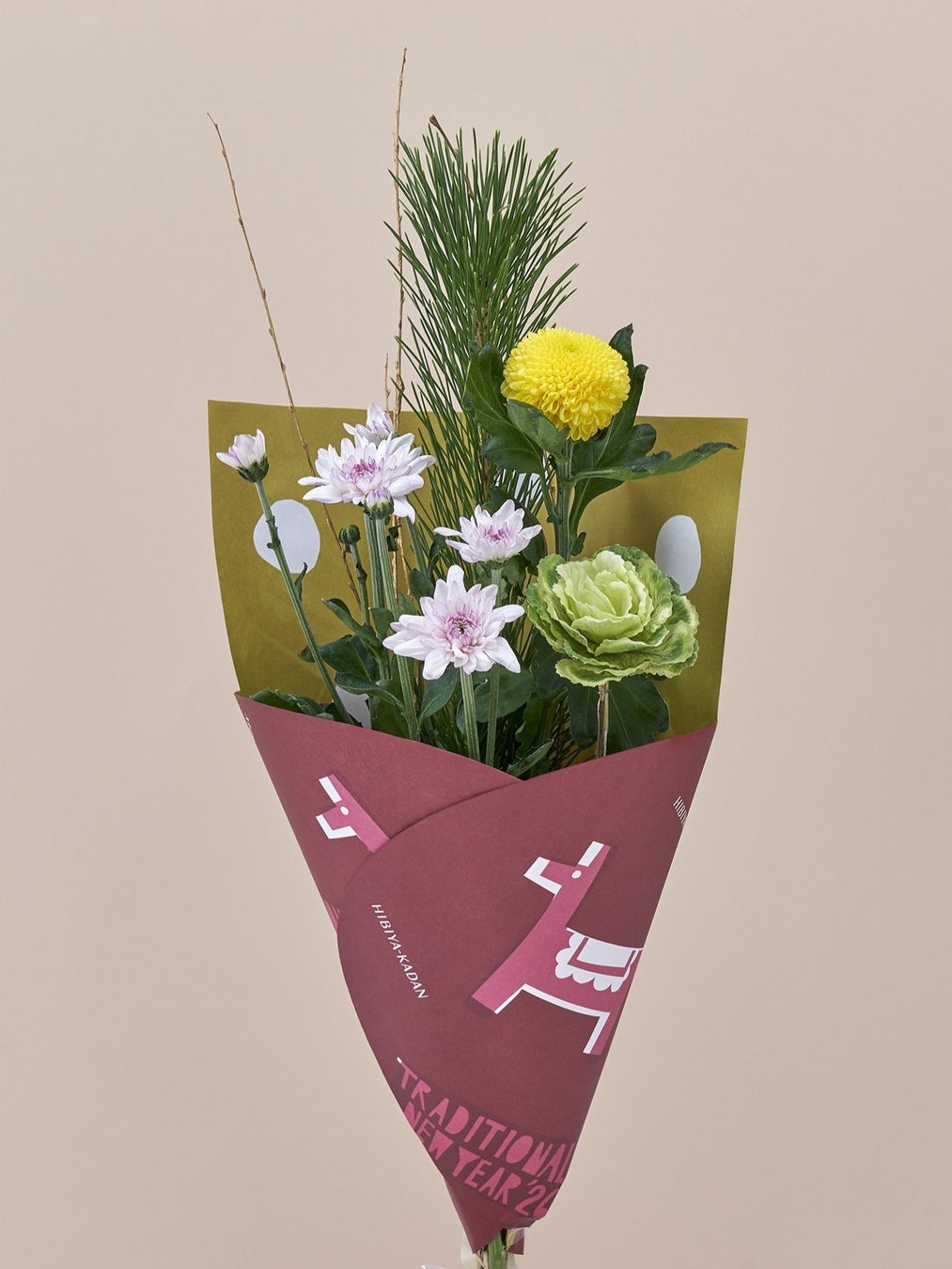 花瓶にあわせて生けるだけで迎春の装いに。縁起の良いマムや葉ボタン、松を束ねた花束を、来年の干支である「午」がデザインされたペーパーが華やかに包み込みます。新年の玄関やリビングを清らかに彩ります。