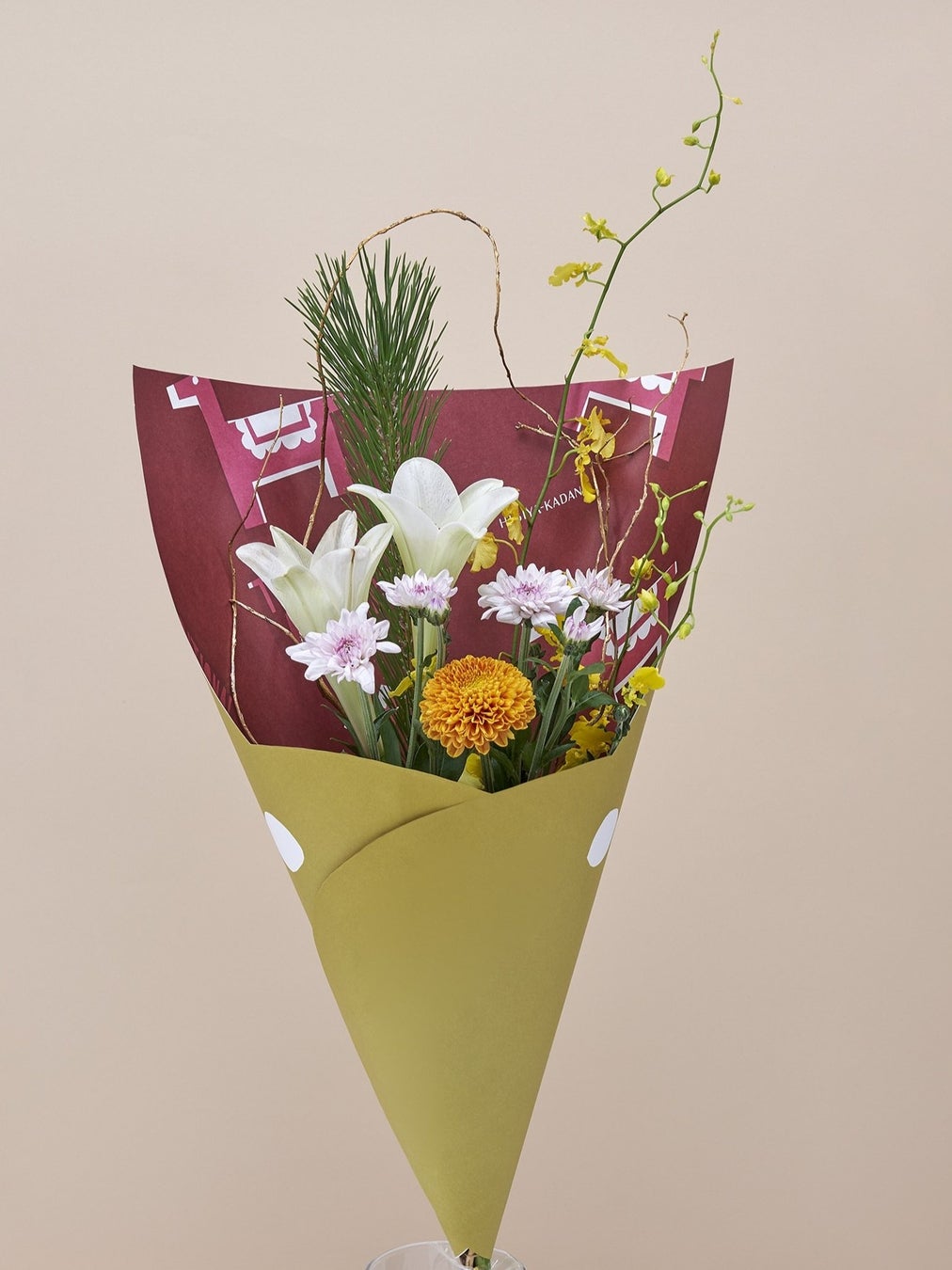 マムや葉ボタン、松をあしらった華やかな新春ブーケ。「椿」が描かれたペーパーが、年のはじまりを晴れやかに演出します。ちょっとしたお手土産や、縁起の良い彩りをリビングに取り入れたい時におすすめです。
