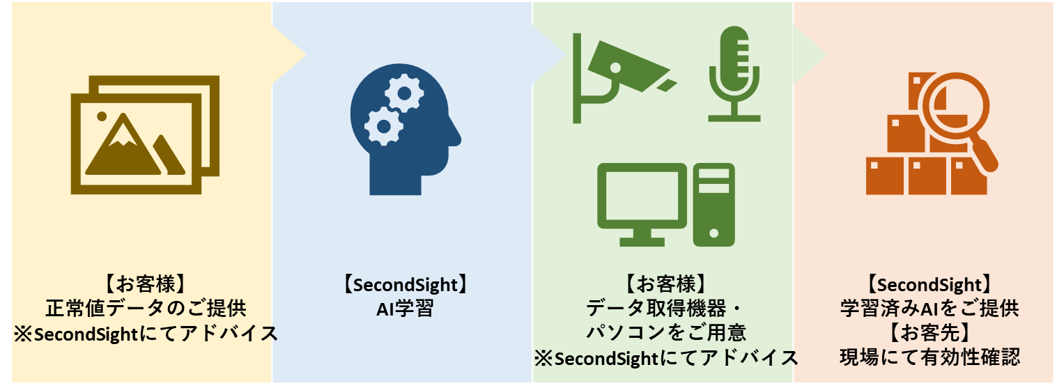 その他 | お客様ご提供の正常値データを弊社にてAI学習。お客様にてご用意のデータ取得機器およびパソコンにて現場検証が可能となります。 (別途、弊社にて導入機器の対応も可能です) |