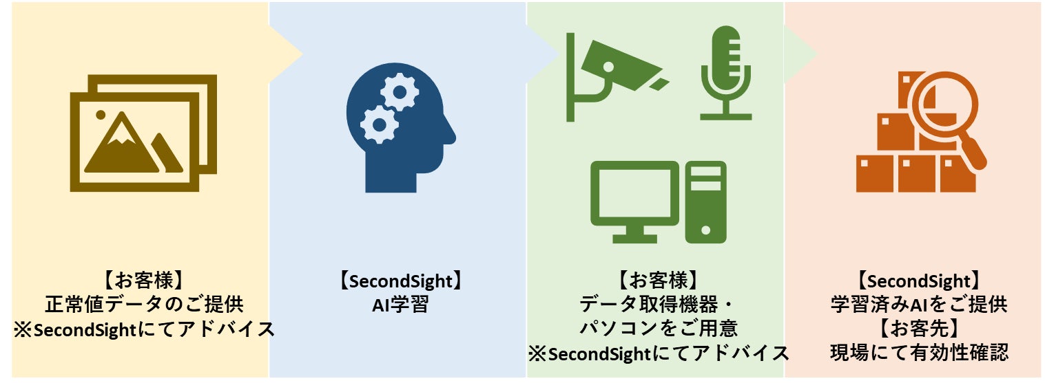 AIによる「目」、「耳」、「鼻」のデジタル化の有効性を確認することが可能となり、製造現場での「官能検査の定量化」「設備の予防・予知保全」「モノ・ヒトの管理」をゼロからご検討いただけるサービスとなります。ご活用いただける分野は、「プラントの異常検知」、「製造業での製品外観検査」、「食品工場での原材料・製品官能検査」「構造物製造工場での製作管理」などを想定しております。