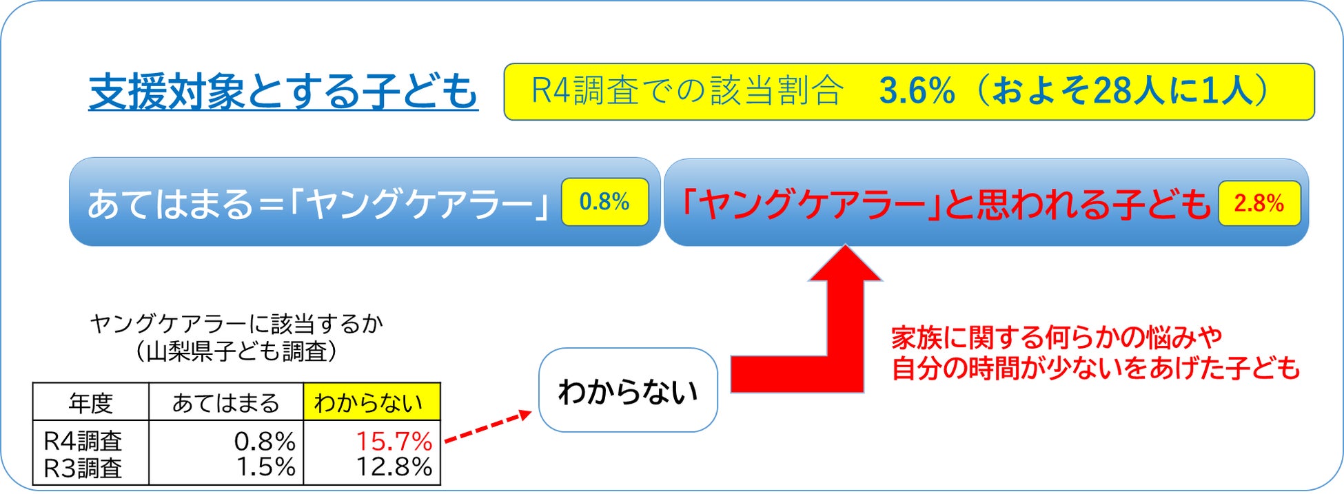 これまでは、「お世話をしている家族がいる」と回答した子どもについて、ヤングケアラーに該当する可能性があると捉えてきたが、この考え方は、よりヤングケアラーの実態に近いものとして、「山梨県独自のヤングケアラーの捉え方」として整理。