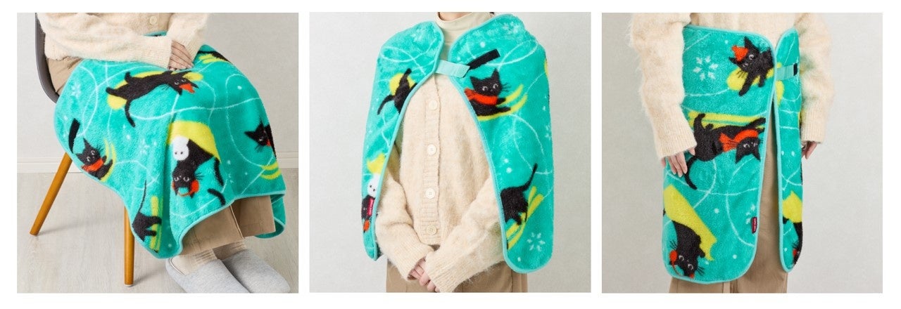 「ブランケット」は、イヤーマフラー、ニット帽などを着用し、雪だるまと共に冬のレジャーを楽しむ黒ねこの姿をデザイン。雪の上をなめらかに動き回る軌跡を描き、遊びに夢中な様子を表現しました。また、ひざ掛け、肩掛け、腰巻きの3Way仕様でお使いいただけるよう、肩や腰で留められるマジックテープ付き。お使いいただく場所や気温によって形を変えられる上に、ふわふわで肌触りは抜群のため、冬の寒さ対策にぴったりのアイテムです。