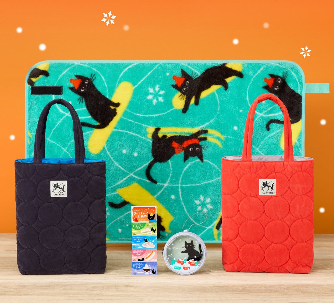『カフェ・ベローチェ』にて、「冬の黒ねこ ハッピーバッグ2025」が新発売!雪遊びをする黒ねこがテーマ!“推し活、ぬい活”にぴったりのスノードームポーチ、3Wayブランケットなど4つのアイテム入り。