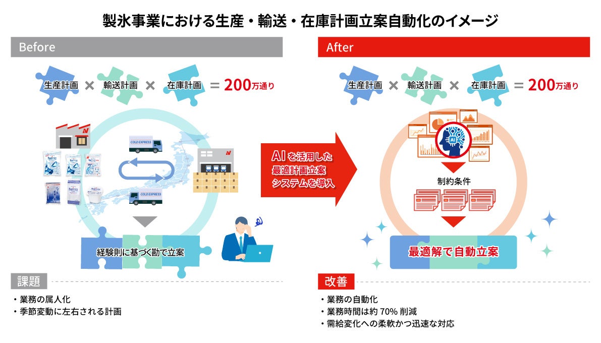 製氷事業を展開するニチレイ・アイス 生産・輸送・在庫計画の立案業務をAIシステム開発により自動化!業務効率化と働き方改革を実現