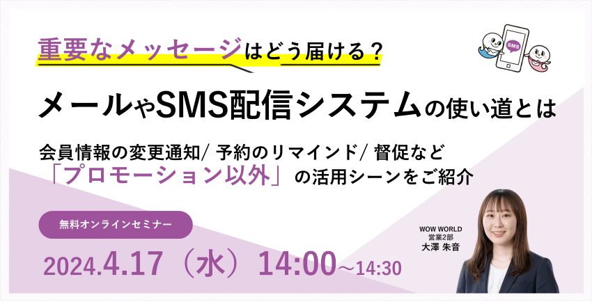 無料オンラインセミナー「重要なメッセージはどう届ける?メールやSMS配信システムの使い道とは」4月17日(水)開催のお知らせ