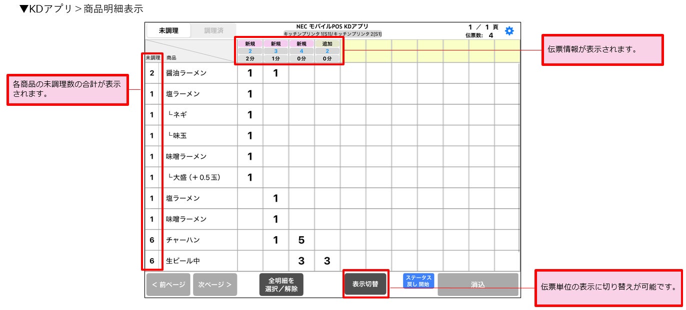 キッチンディスプレイで新たなレイアウトが追加されました。商品毎に数量や未調理数の表示、消込ができるようになります。