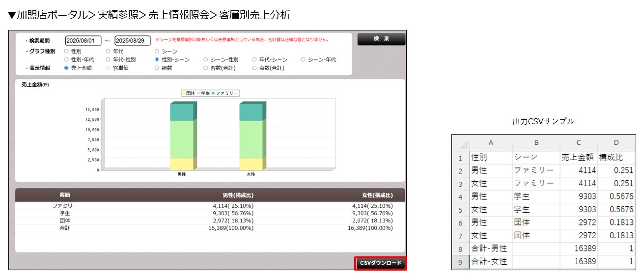 客層別売上分析のデータをCSVダウンロードできるようになりました。期間指定から、性別、年代、シーン別はもちろん、売上金額、客単価、組数や客数など取捨選択の上、CSVダウンロードできるようになります。