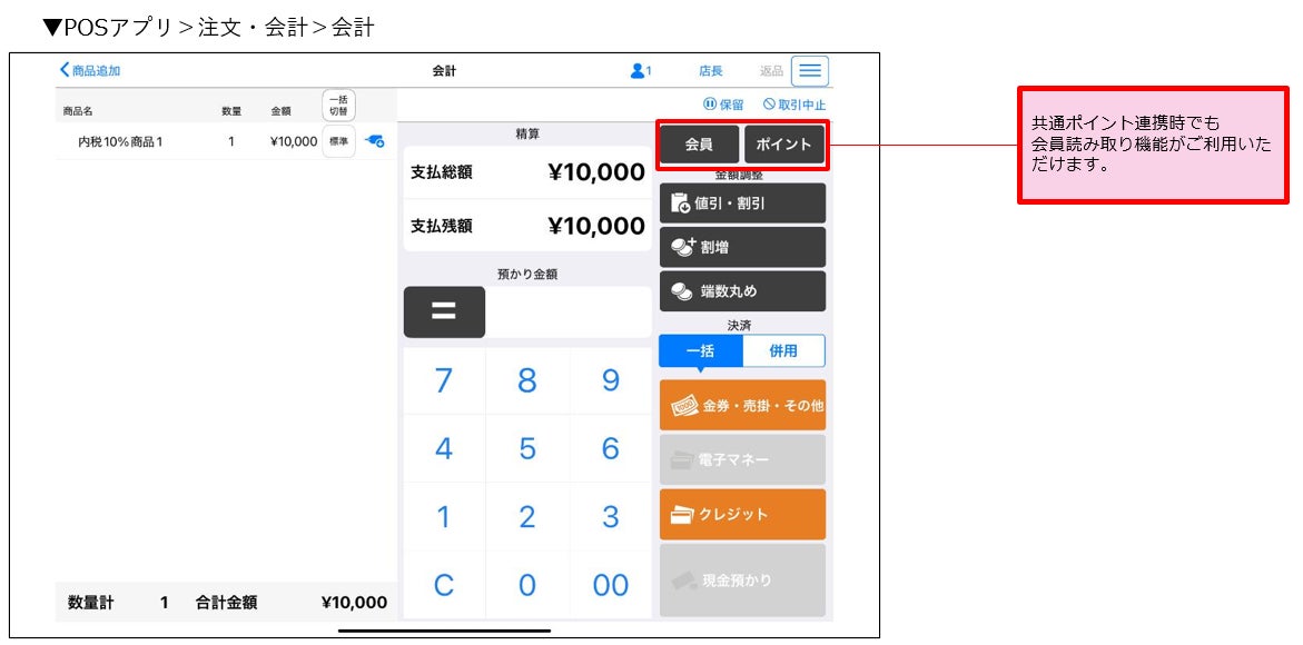 共通ポイント機能と会員番号読取り機能が併用できるようになりました。なおハウスマネー・ポイントシステム連携時は併用不可となります。