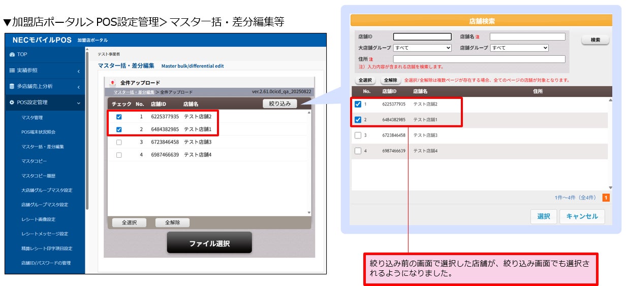マスタ一括・差分編集やマスタコピー時に、絞込み前の画面で選択した店舗が、絞込み画面でも選択されるようになりました。対象店舗を絞込む際の挙動がわかりやすくなります。