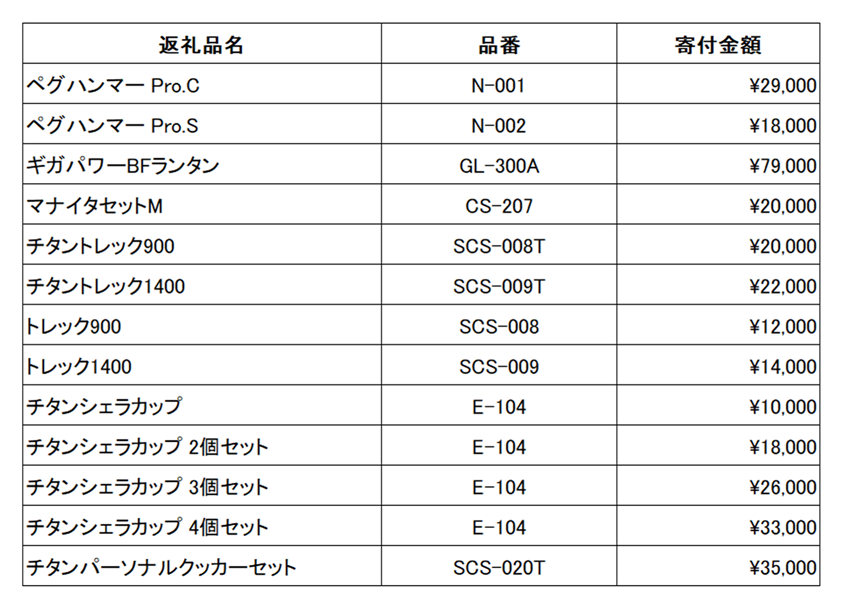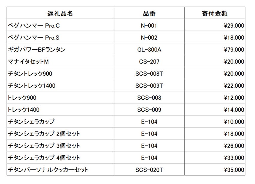 ●スノーピークの「チタンシェラカップ」や「チタンパーソナルクッカーセット」など13品目を新規返礼品として採用。楽天ふるさと納税、ふるさとチョイス、ふるなび、さとふるへ7月4日(火)20:00に出品