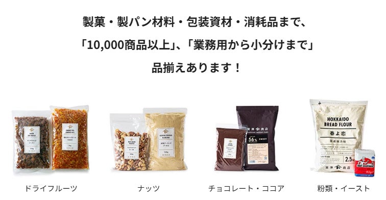実店舗販売とEC、卸販売を通じパンやお菓子の材料をはじめ、器具・道具やラッピング資材、スパイス、和菓子材料、洋食材、和食材、豆、中華、エスニックにいたるまでの幅広いカテゴリー、産地・品質にこだわった10,000以上の食材を中心とした豊富なアイテムをリーズナブルな適正価格でお客様へお届けしております。