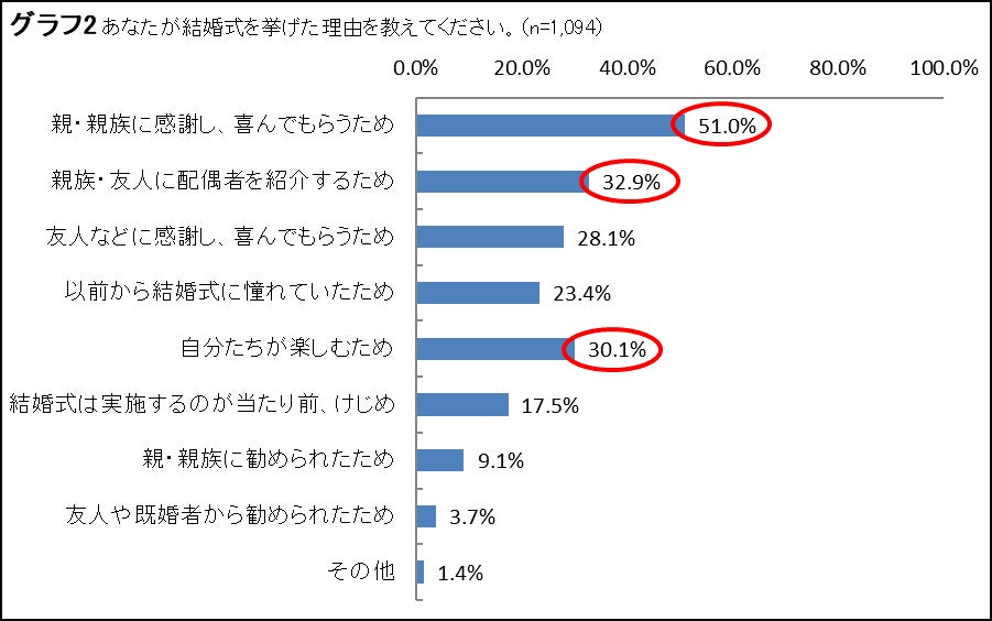 ・結婚式を挙げた理由を聞いたところ、「親・親族に感謝し、喜んでもらうため」が過半数の51.0%と最も高く、続いて「親族・友人に配偶者を紹介するため(32.9%)」「自分たちが楽しむため(30.1%)」であった。