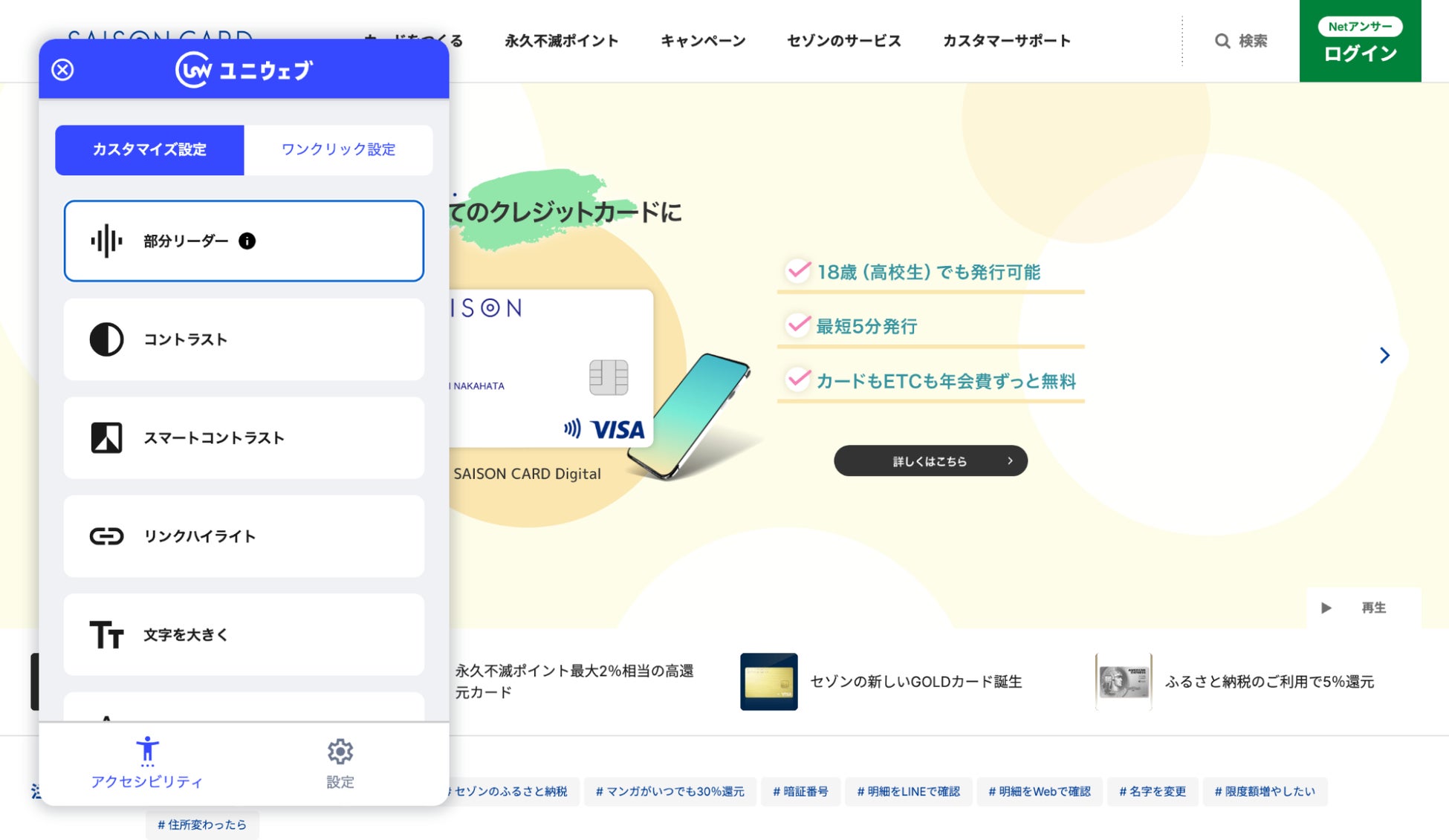 人型アイコンをクリックすると、アクセシビリティメニューが表示され、文字を読み上げてくれる部分リーダーや画面のコントラスト切り替えなどがボタン1つで可能です。