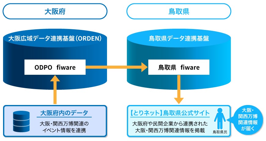 2025年4月から開催される大阪・関西万博を見据え、大阪広域データ連携基盤(ORDEN)の一部機能であるODPO fiware と鳥取県データ連携基盤を連携させ、大阪府から鳥取県に対して大阪・関西万博関連情報を提供し、鳥取県側の住民向け情報サイトにて大阪・関西万博関連情報を配信します。