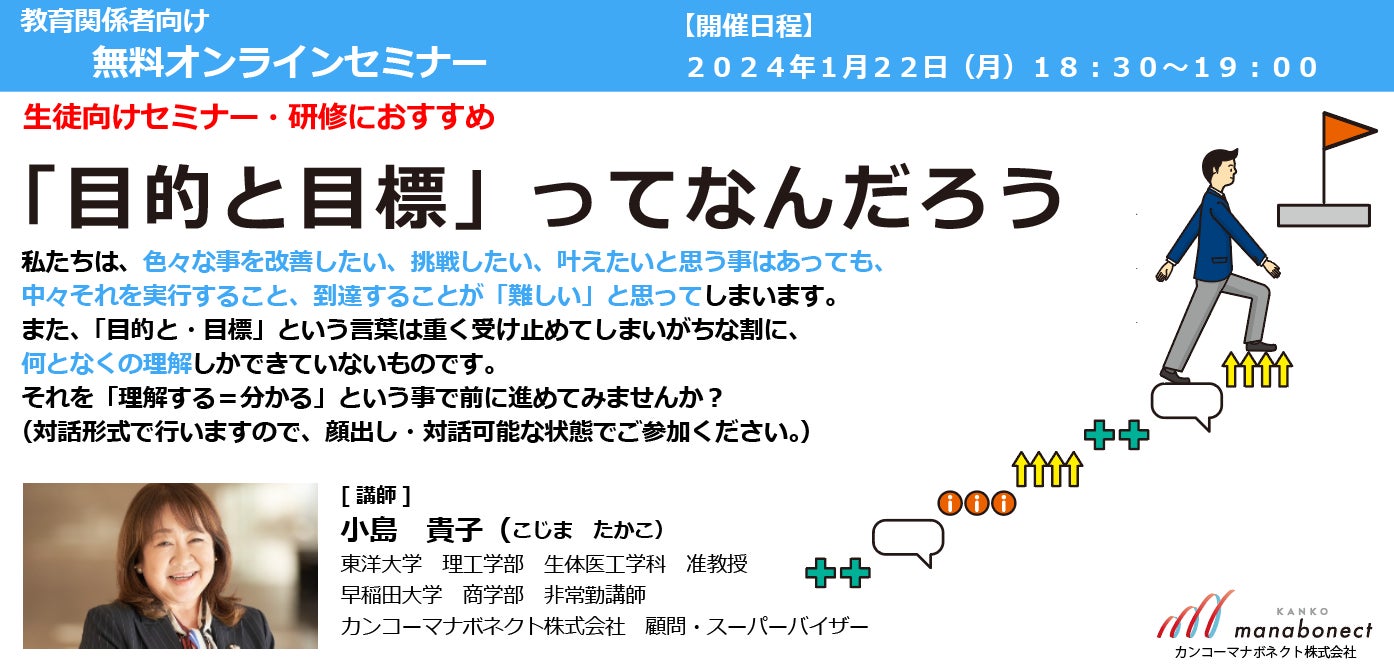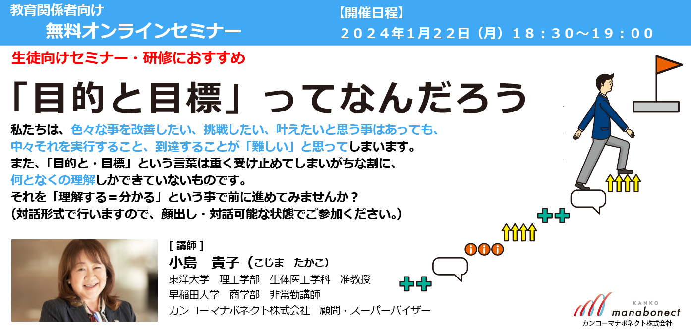 1/22開催 教育関係者向け無料オンラインセミナー「“目的と目標”ってなんだろう」~“目的と目標”を理解し、思考や行動につなげるためには~