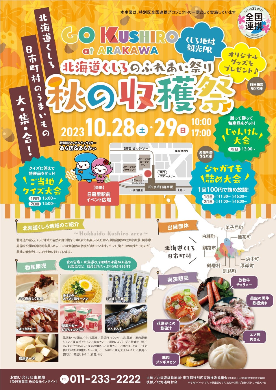 北海道釧路総合振興局は、東京都荒川区日暮里駅前イベント広場で開催される「北海道くしろのふれあい祭り 秋の収穫祭」(主催:北海道釧路地域・東京都特別区交流推進協議会)に参加し釧路地域の観光PR等を実施します。